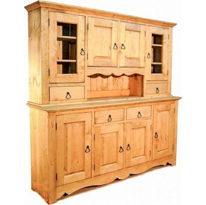 Комплект из нижней тумбы и верхнего буфета выполнен в стиле Прованс. В нижней части отлично разместятся соленья-варенья, посуда и скатерти. За стеклянными дверцами можно хранить праздничные сервизы, семейные раритеты, интерьерные вещицы.  Задние стенки всех буфетов набраны из дощечек массива сосны. Также из массива сосны набраны днища ящиков. В конструкции нет элементов из фанеры, ДСП, или МДФ.