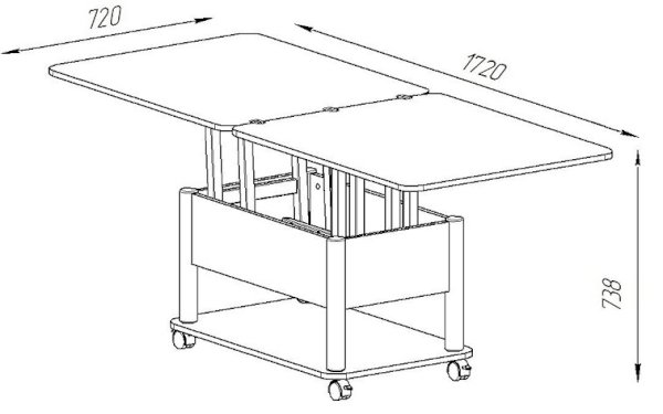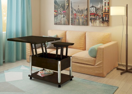Стол-трансформер - очень удобная вещь для экономии пространства дома. Оборудован колесиками. Стол имеет механизм трансформации, обеспечивающий одновременное раскладывание большой (с откидной частью) и малой (поддерживающей) столешницы, что позволяет образовать два конечных положения: