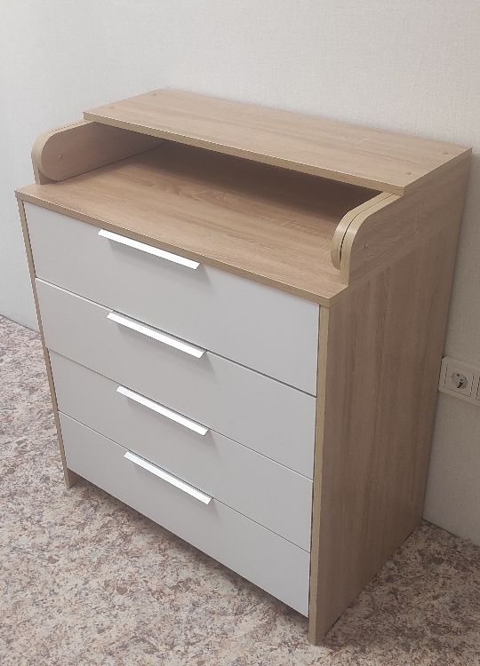 - внешний вид. Цвет дерева полностью вписался в интерьер. Понравились ручки на ящиках; - большой пеленальный столик. Он довольно широкий, механизм вроде крепкий. В крышке комода изначально отверстия под пеленальный столик не сквозные, поэтому можно использовать комод без столика. Чтобы закрепить столик, нужно просверлить отверстия.
