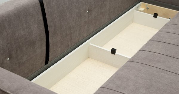 Комплект состоит из прямого и углового диванов, кресла для отдыха и пуфа.