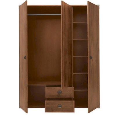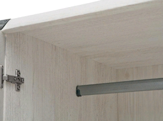 За правой распашной дверью расположено отделение с 5 полками. За 2 распашными дверями в верхней части расположена стационарная штанга для одежды, в нижней части – отделение и 2 выдвижных ящика на металлических роликовых направляющих. Внутри шкафа на центральной двери расположено зеркало