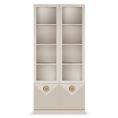 Шкаф-витрина выполнен в таких материалах как ЛДСП сатин и МДФ в матовой плёнке ПВХ с поверхностью soft touch. Лицевая фурнитура в цвете золото подчеркивает рисунок фрезеровки фасадов и делает мебель нарядной.