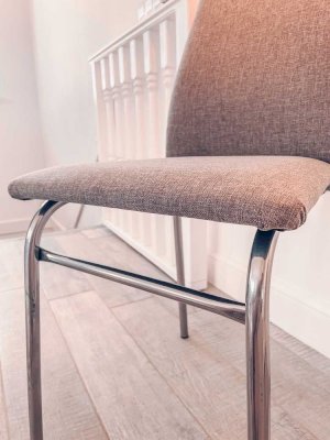 Сидение и спинка стула мягкие, обитые мебельной тканью. Универсален, удобен в использовании. Эргономичная спинка поддерживает не только поясницу, но и лопатки, тем самым сохраняет осанку. Изделие установлено на устойчивых металлических ножках с пластиковыми заглушками.