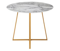 Лаконичный обеденный стол для кухни. Круглая столешница с рисунком белого мрамора выполнена из МДФ - прочного, экологически безопасного материала, который устойчив к перепадам температур и повышенной влажности. Поверхность столешницы декорирована рисунком белого мрамора, который идеально сочетается с металлическими ножками. Защитные подпятники на ножках предотвращают порчу напольного покрытия.