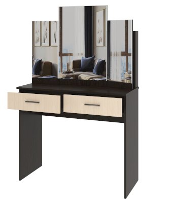 Столик туалетный с 2-мя ящиками на роликовых направляющих с задней надстройкой для хранения косметики. Боковые зеркала поворотные, на карточной петле.
